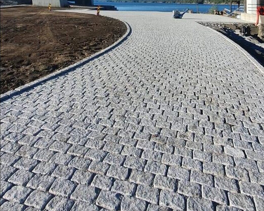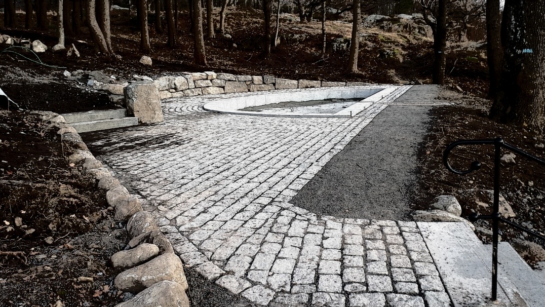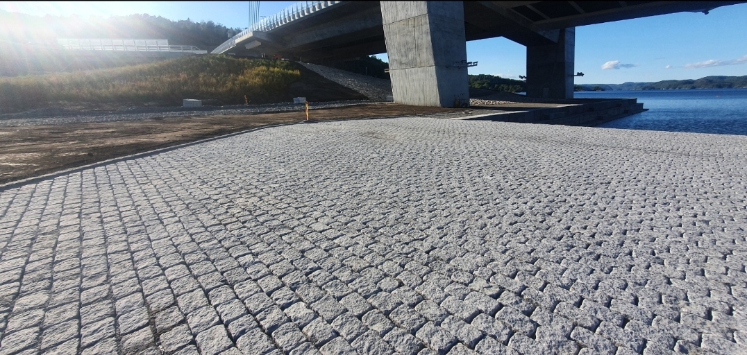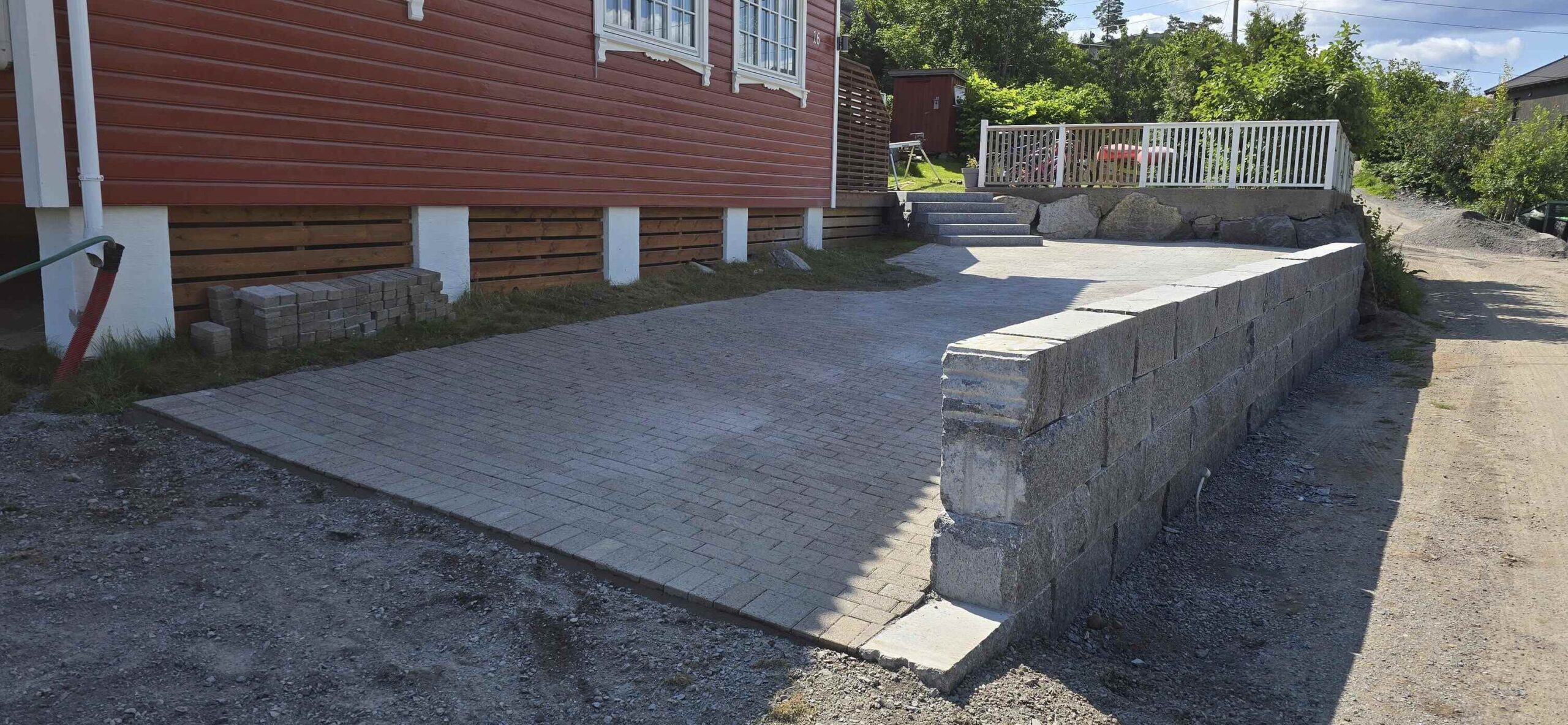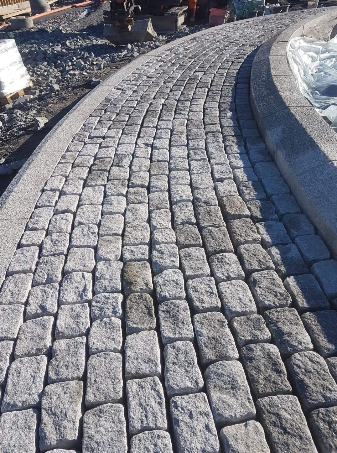 Et representativt prosjekt med smågatestein og natursteinsmur. Vi leverte en robust og stilren løsning til uteområdet ved kulturbygget.
